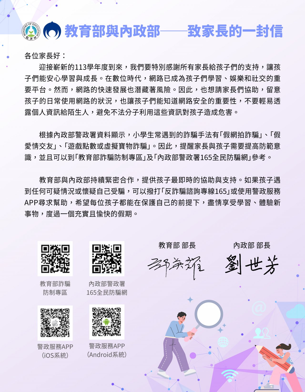 「教育部與內政部-致家長的一封信」:為提升學生及家長之防詐免疫力,提醒家長有關小學生常遇到的詐騙手法,並提供相關防詐參考資訊。